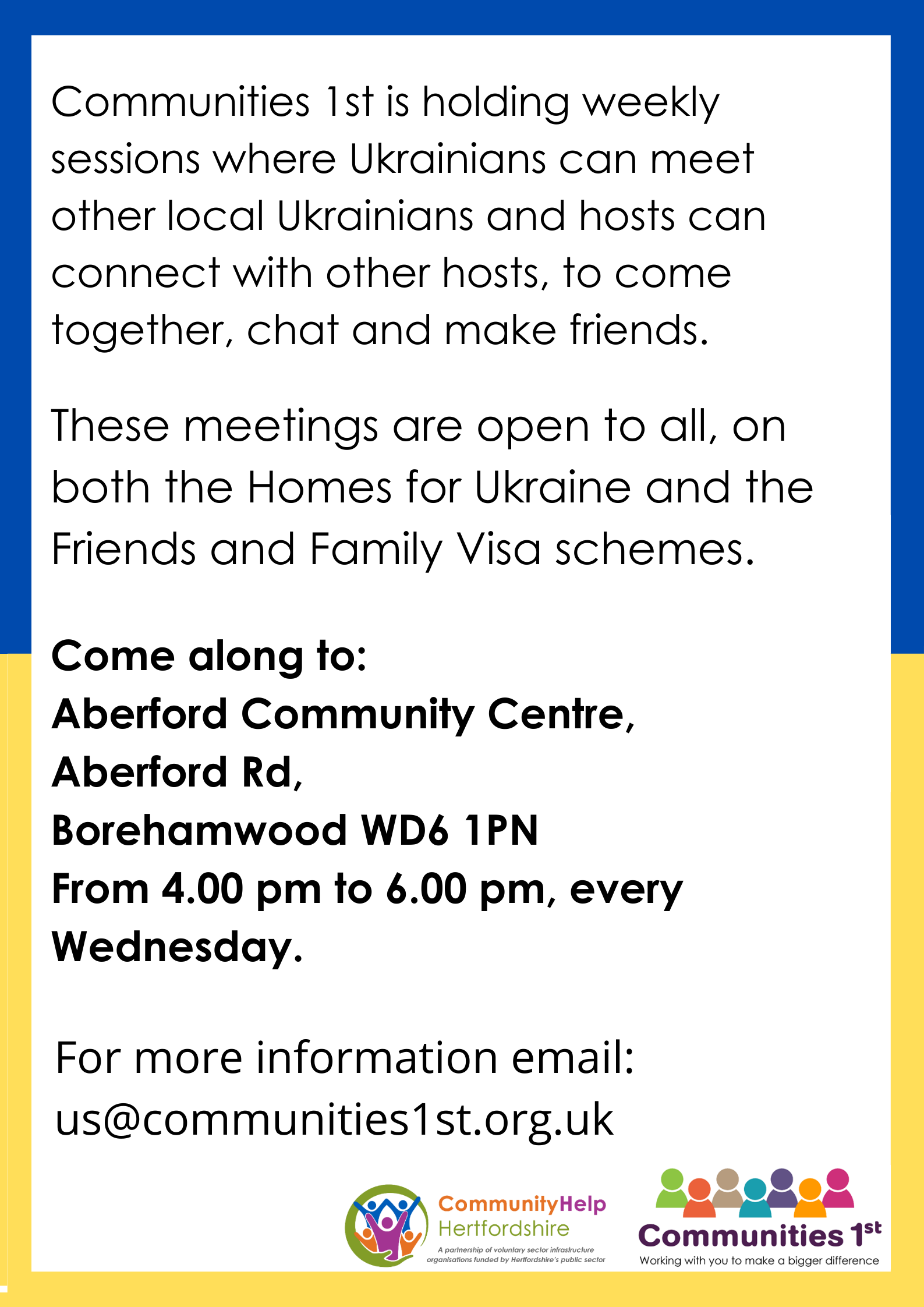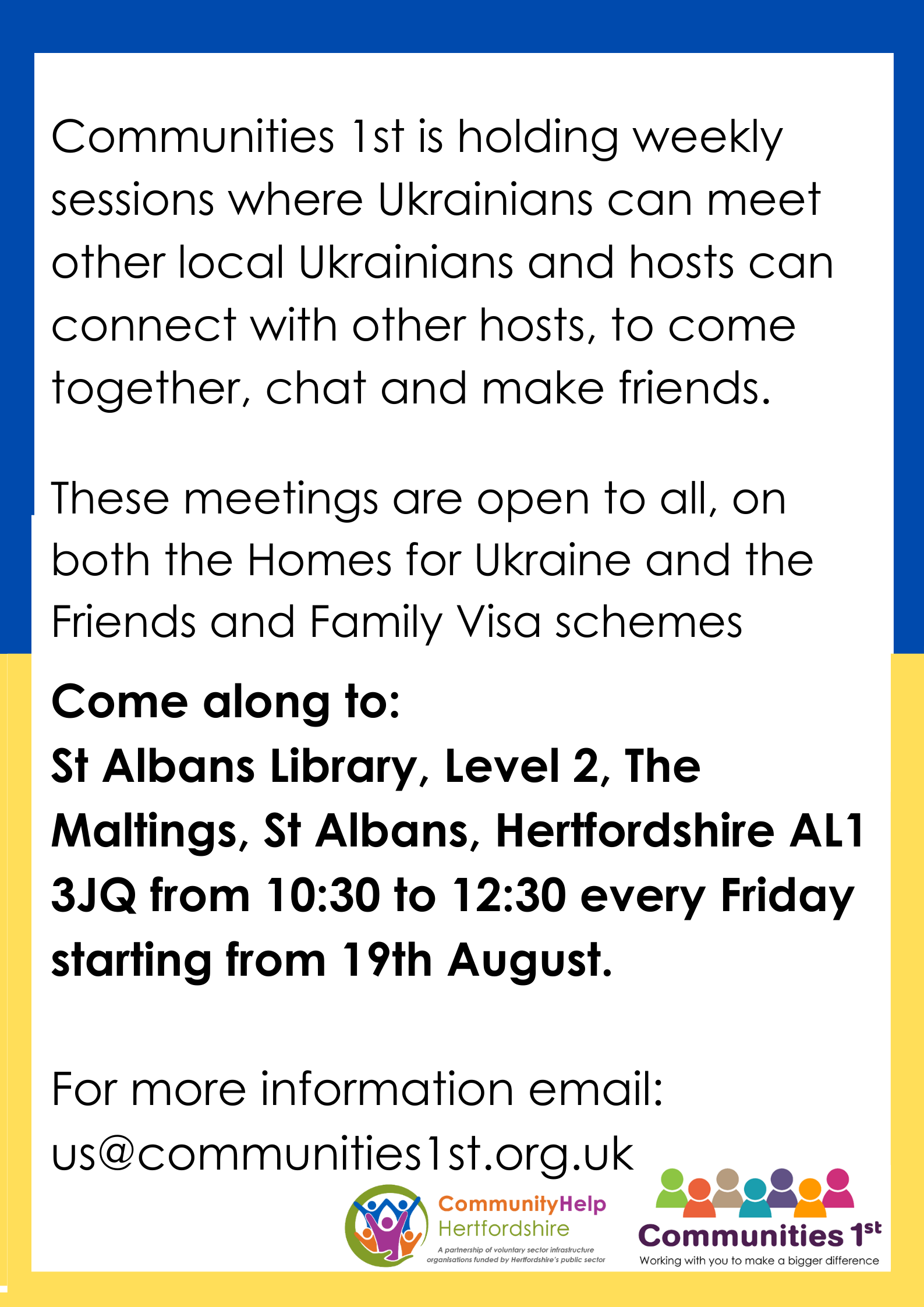 Come along to a weekly session where Ukrainian guests can meet other Ukrainians living locally and hosts can meet other local hosts.