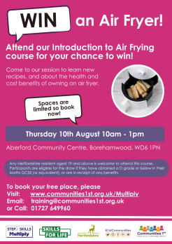 Have an Air fryer or considering buying one? Looking to cook cheaper and healthier? Come along to our cooking with an Air Fryer 3 hour session. Learn to cook with one, add new recipes and learn about the cost savings. Cooking tips will be provided on this free course along with a chance to taste food cooked in the air fryer.