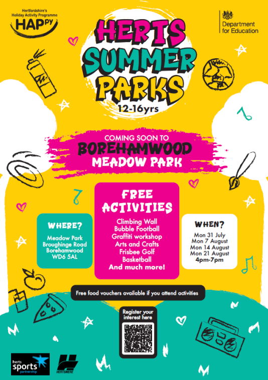FREE summer activities have been planned for Moatfield Park in Bushey across the summer holidays for young people aged 11 – 17 years. Booking in advance is not required as all sessions are drop-in. Activities will be delivered by Watford FC and Sporting Inspirations and supported by Hertfordshire County Council's Services for Young People and will include Football, Tennis, Dodgeball and Rounders! The activities will take place on Tuesdays, Wednesdays and Fridays. Full times and dates are included in the flyer below.