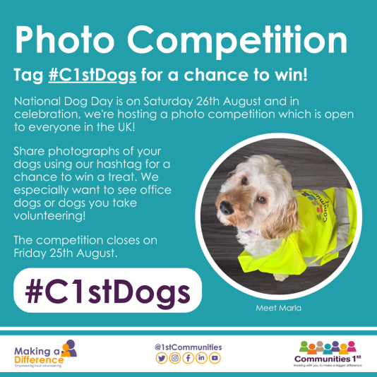 Take a photograph of your dog (at work, in your home office, or just out and about). Upload it to Twitter (X), Instagram or Facebook with the hashtag #C1stDogs . Follow Communities 1st and engage with other entries via the hashtag.
