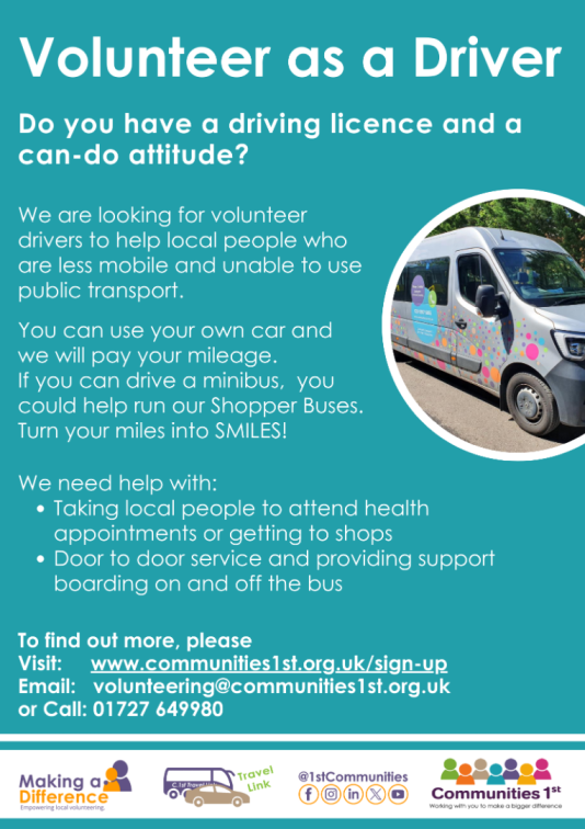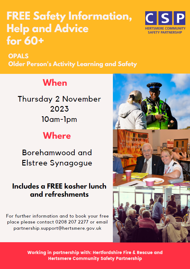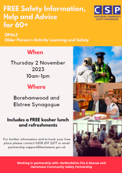You can also find us on Thursday 2nd November at the "Free Safety Information, Help and Advice for 60+ " at the Borehamwood and Elstree Synagogue (10am -1pm). Come to see us and find out where to find free information and help available to you. Details can be found in the newsletter.