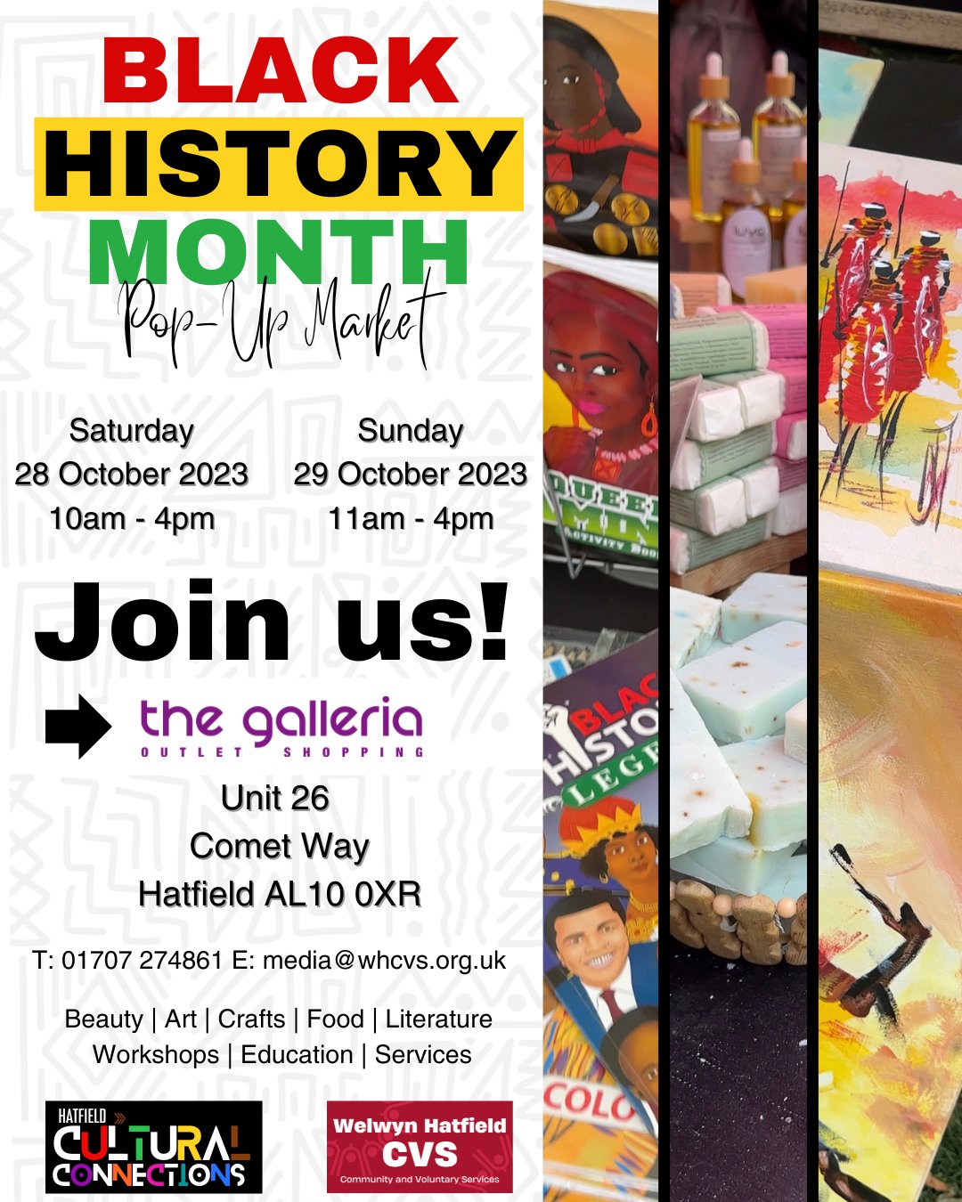 This weekend (Saturday 28th and Sunday 29th October) Communities1st will be attending Black History Month Pop-Up Market at The Galleria Hatfield, come to say HI!