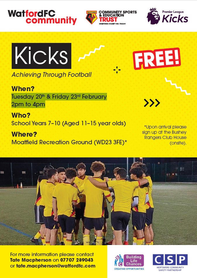 Watford FC Community Sports and Education Trust and Sporting Inspirations organise free sporting activities for young people taking place during the February half term in Moatfield Park, Bushey.