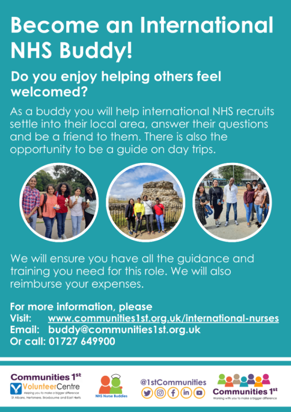 We have recently had a lot of new sign ups from Watford General Hospital to our International Nurses Project. Many of these new NHS recruits would like a one to one nurse buddy volunteer to support them as they settle in. This role aims to support new nurses in getting to know their local area, and allows them to have a dedicated person to go to with any questions they may have. You do not need to live in Watford to help with this, but you may need to show a nurse around the local area so some knowledge of the area would be beneficial. Please email us if you would like to find out more.