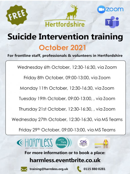 Spot the Signs & Save a Life are a suicide prevention campaign, helping to remove the stigma of talking openly about suicide. They provide training courses and signpost to mental health services available in Hertfordshire. Their fully funded training for voluntary and public sector employees, working with adults in Hertfordshire, are still being delivered online via Zoom.