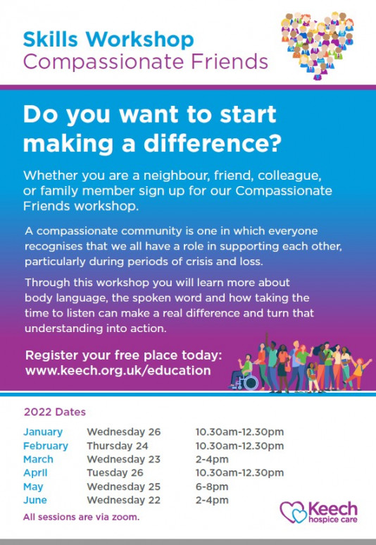 Next Thursday, 24th February, Keech Hospice Care are hosting another Compassionate Friends workshop. Through this workshop, you'll develop your communication skills, and learn how taking the time to listen can really make a difference. Sign up here.