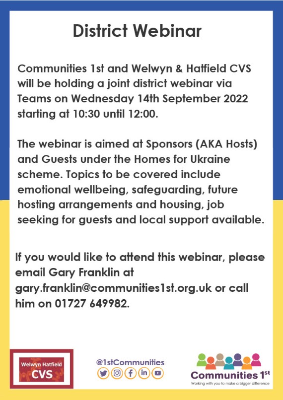 Either way, read on for details of events that will support you in your work, including the Stronger Together Networks in September and the Communities 1st/ Welwyn Hatfield CVS webinar for sponsors of Ukrainian guests.