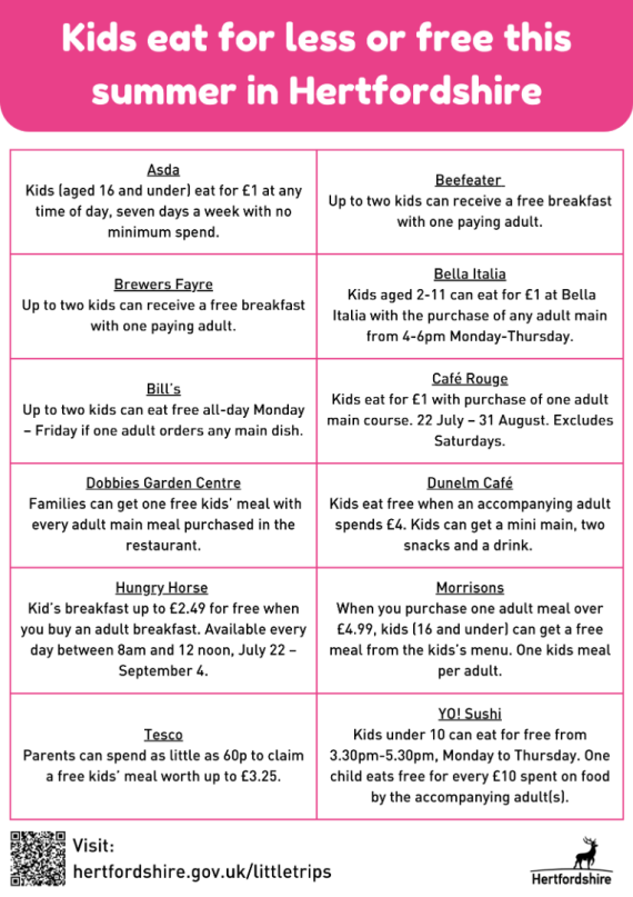 Anyone who wants a meal for themselves and their family over the summer, whether or not they are currently claiming benefits or free school meals, will be able to collect from hubs based in Borehamwood, Potters Bar and Bushey every week day until Friday 2 September, excluding the August bank holiday.