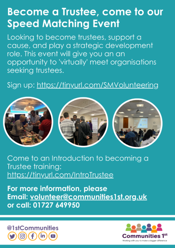 This event enables organisations seeking to recruit volunteer trustees to ‘virtually’ meet potential candidates, and those interested in becoming trustees to find a local organisations they would like to support.